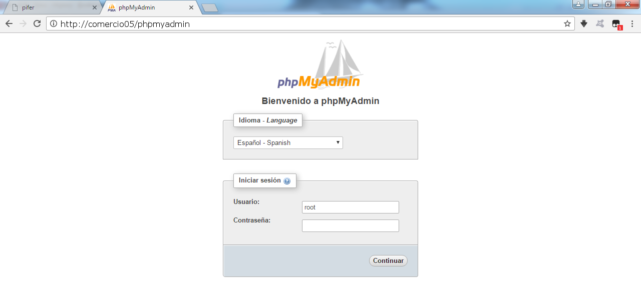Introduciremos el usuario root (administrador) y la contraseña que le dimos al instalar el servidor. En Xampp no existe.
