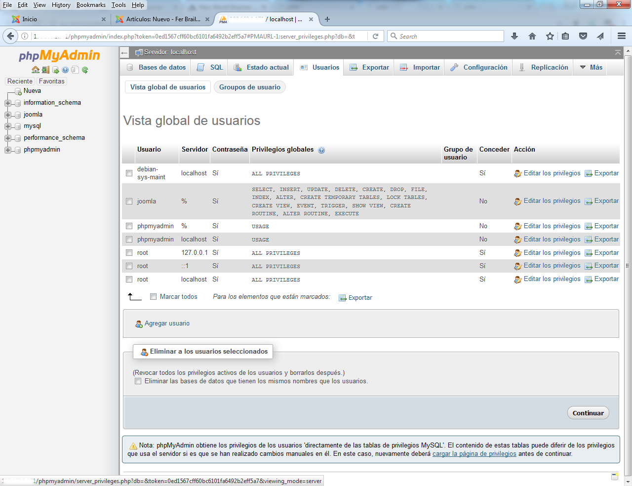 Luego daremos de alta el usuario joomla desde la sección usuarios con los siguientes permisos (si no se los hemos dado al crear el usuario lo podemos actualizar dando al botón "editar los privilegios":
